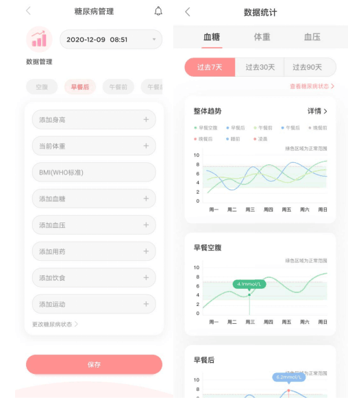 如果懷孕期間查出了糖尿病,下方還可以更改糖尿病狀態(tài),當(dāng)改變狀態(tài)后,所有的數(shù)據(jù)都會(huì)調(diào)整成對(duì)應(yīng)狀態(tài)的判斷標(biāo)準(zhǔn)。在下方還可以記錄相關(guān)的用藥與飲食,通過(guò)設(shè)置測(cè)血糖提醒、吃藥提醒,到點(diǎn)就會(huì)有鬧鐘提示,方便又快捷,有效監(jiān)測(cè)健康指標(biāo)變化。