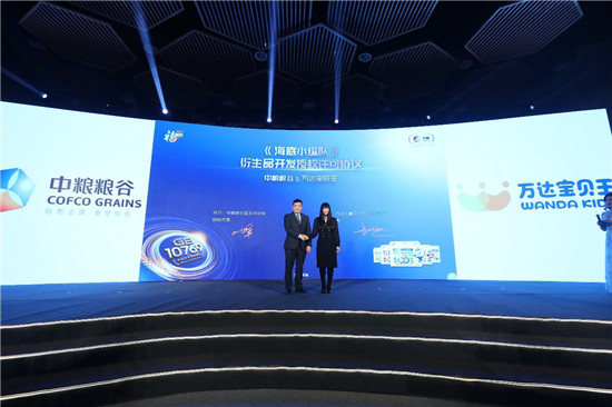 發(fā)布儀式上,萬達(dá)海底小縱隊(duì)產(chǎn)品廣告片的播放及新品發(fā)布啟動(dòng)環(huán)節(jié)點(diǎn)燃了整場(chǎng)大會(huì)的高潮。在場(chǎng)與會(huì)嘉賓一齊上臺(tái),為新品發(fā)布共同按下了啟動(dòng)按鈕,由此揭開了中糧福臨門寶寶?蔬優(yōu)營養(yǎng)面上市篇章。中糧福臨門寶寶蔬優(yōu)營養(yǎng)面在開發(fā)初期,與萬達(dá)寶貝王集團(tuán)擁有全版權(quán)的全球知名IP《海底小縱隊(duì)》達(dá)成了戰(zhàn)略合作。萬達(dá)文化集團(tuán)高級(jí)副總裁兼寶貝王集團(tuán)總裁張春遠(yuǎn)先生向大家詳細(xì)介紹了萬達(dá)寶貝王及《海底小縱隊(duì)》的未來發(fā)展戰(zhàn)略。作為萬達(dá)寶貝王集團(tuán)的核心板塊,IP業(yè)務(wù)也將借助萬達(dá)集團(tuán)全產(chǎn)業(yè)鏈,充分釋放IP授權(quán)的獨(dú)特價(jià)值。未來,萬達(dá)寶貝王將與中糧糧谷攜手為中國兒童的快樂、健康成長(zhǎng)營造良好環(huán)境,《海底小縱隊(duì)》作為福臨門寶寶?蔬優(yōu)營養(yǎng)面的代言人,也將持續(xù)深耕內(nèi)容,與中糧糧谷一起為中國兒童營養(yǎng)改善行動(dòng)計(jì)劃做出貢獻(xiàn)。