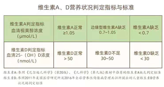 我們必須正視一個事實:我國兒童維生素 A、D 整體營養(yǎng)水平未達標(biāo)??吹竭@媽媽可能不免疑惑:怎么才能判定寶寶是否達標(biāo)呢?對此,補充指導(dǎo)也給出了明確標(biāo)準(zhǔn):