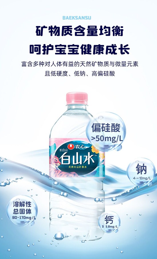 農(nóng)心白山水還富含多種天然礦物質(zhì)與微量元素,且低硬度、每升含鈉量為4~12毫克,偏硅酸含量高達50毫克以上。偏硅酸是嬰兒水中很重要的一個成分,對寶寶牙齒生長、骨骼發(fā)育,營養(yǎng)均衡,有很重要的作用。